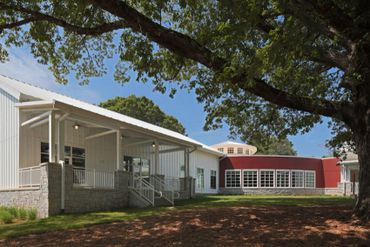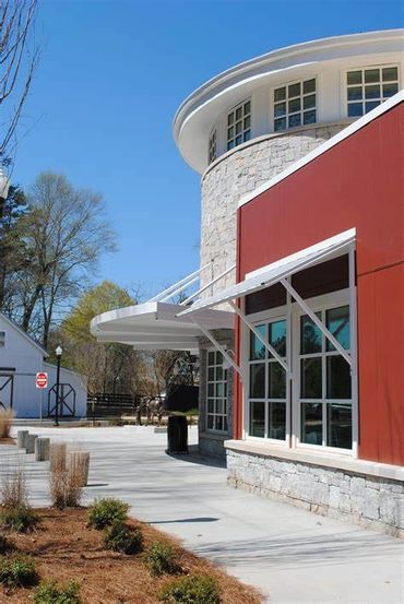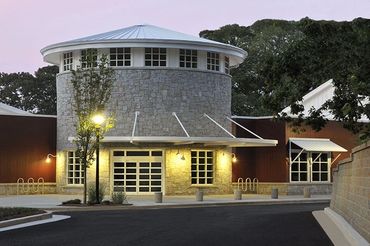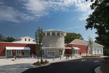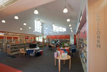This state-of-the-art library was designed as four distinct building forms inspired by the Milton area’s equestrian and agrarian vernacular. The larger reading and community room wings use sloped, gabled roofs, awnings, clerestory windows and porches. The generous use of glass allows for views out to the community green and historic oak while allowing views in from the street. The third building form is the low-height connector between the community and reading room wings that includes patron and building support. The fourth component is the entrance ‘silo’ and lobby which, with its higher roof line, helps orient patrons through a unique landmark as the building entrance. The interior layout was designed to maximize useable area and ease of use for patrons while providing constant visual connection to the outdoors.